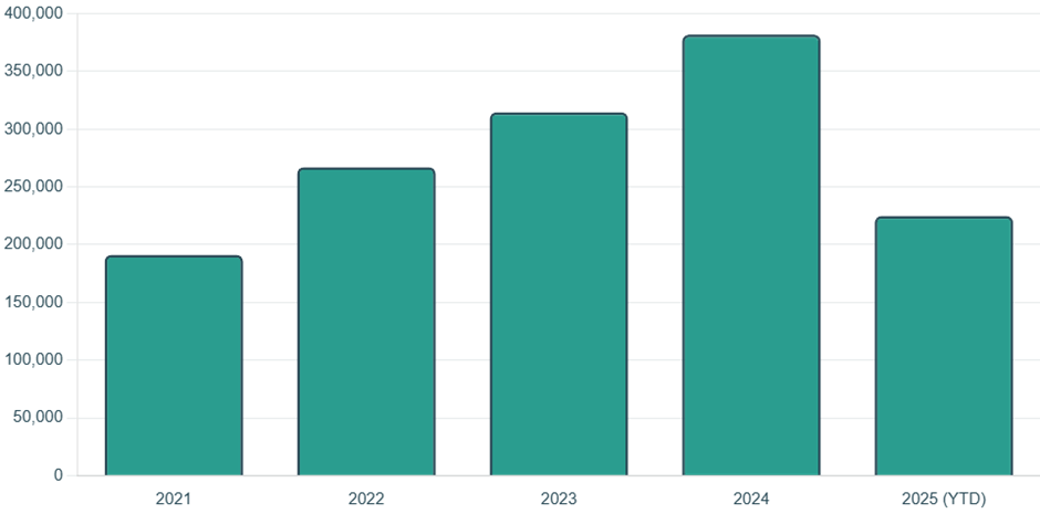 This chart shows the steep upward trajectory of new Battery Electric Vehicle (BEV) sales, with 2025 on track to set another record.